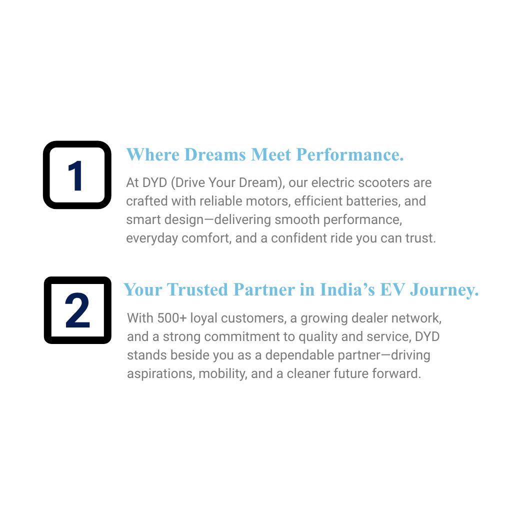 Founded in 2025, DYD (Drive Your Dreams) is a forward-thinking electric mobility brand based in Gurgaon, driven by a simple yet powerful vision: to connect every Indian with their ideal mobility solution. In a rapidly evolving world, we believe mobility should be smart, sustainable, and accessible—without compromising on style, comfort, or performance.